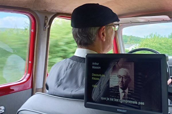 Deux petits écrans intégrés dans le véhicule diffusent de courtes séquences, déclenchées par GPS : anecdotes cocasses et images d’époque des villages traversés, ...